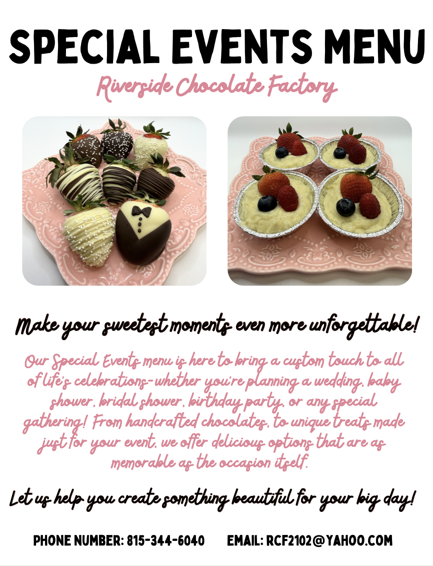 Take a look at our special events menu below! You will find individual prices for each item. Want bulk pricing or have questions? Fill out the form at the bottom of this page and we will be in touch with you! Help us create something perfect for your special day!